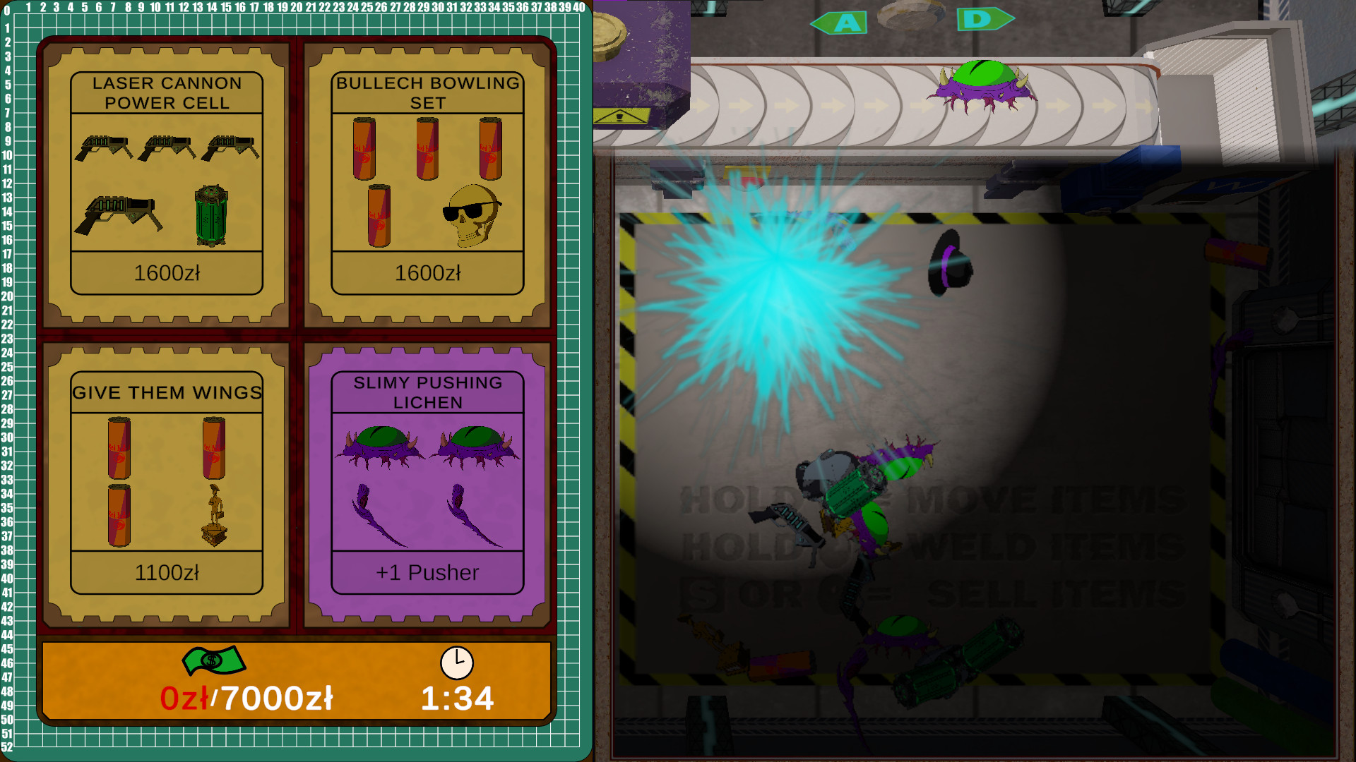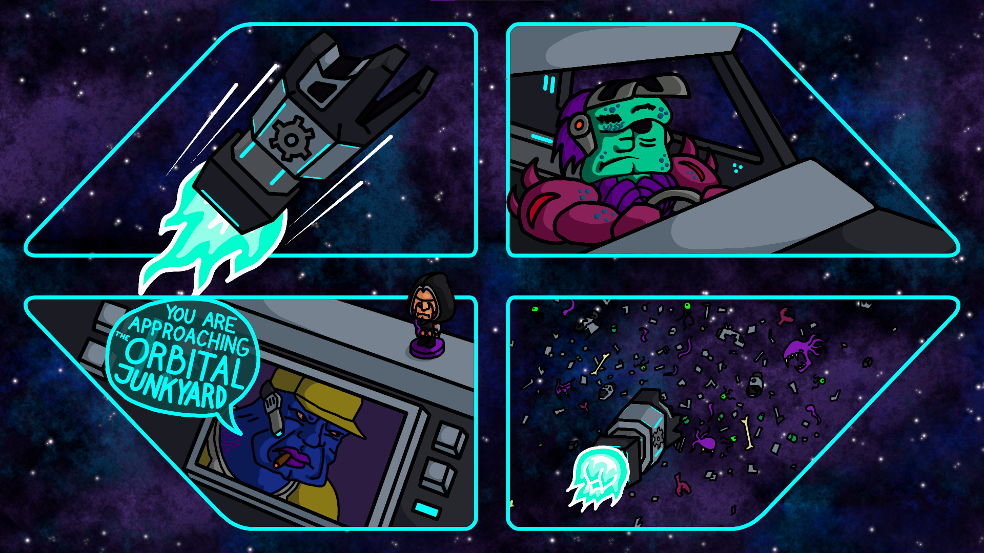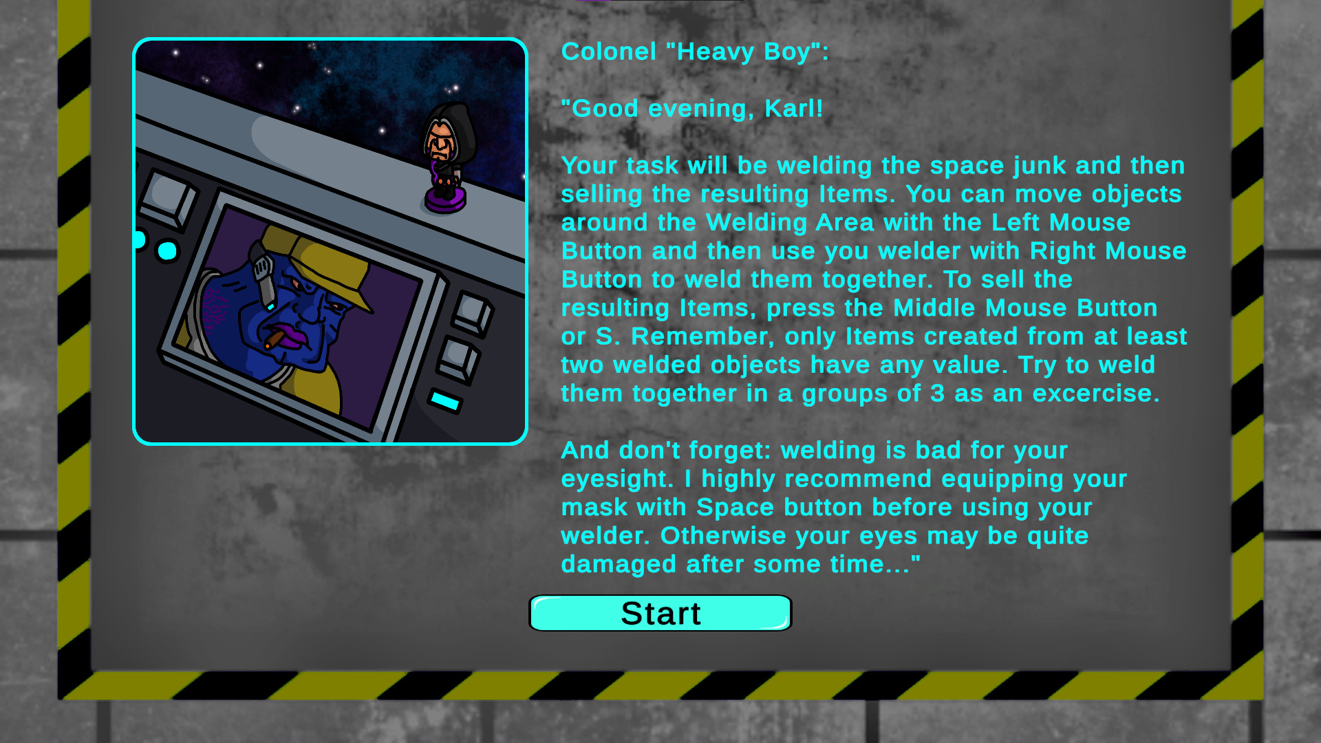 From this day on, you're starting your first shift in our new Space Junkyard Utilization Program! Your task will be to weld together the space junk that floats into your ship and then send it down to planet Bullech. You can also weld together some upgrades that will improve your welding skills. We want to see if our program will turn out profitable, so we are challenging you with increasing deadlines every day. Complete the full week of those deadlines to prove that you can do it and you will be handsomely rewarded. And what's more important, you'll bring wealth and prosperity to the people of Bullech!